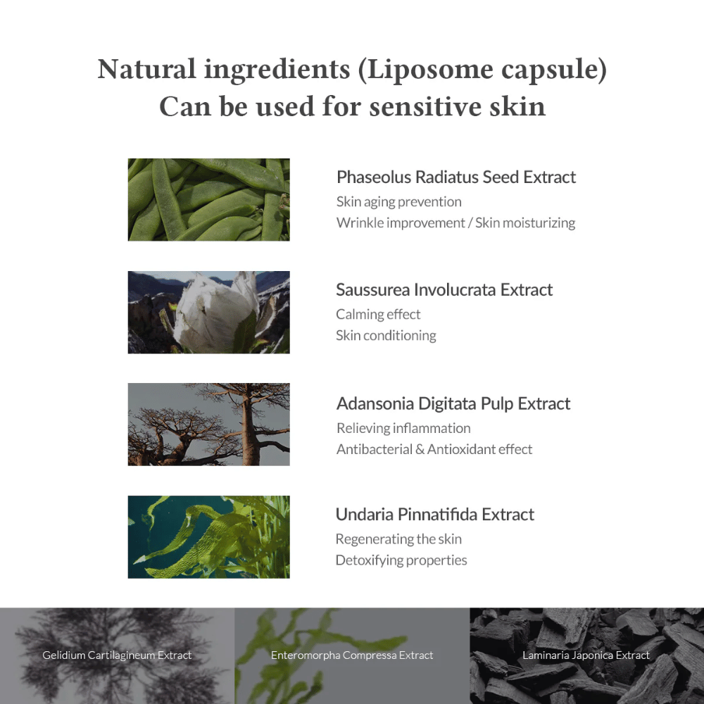 Water/Aqua, Glycerin, 1,2-Hexanediol, Butylene Glycol, Phenoxyethanol, Arctium Lappa Root Extract, Chrysanthemum Sinense Flower Extract, Codonopsis Lanceolata Root Extract, Hovenia Dulcis Fruit Extract, Magnolia Kobus Branch/Flower/Leaf Extract, Salix Alba (Willow) Bark Extract, Schisandra Chinensis Fruit Extract, Hamamelis Virginiana (Witch Hazel) Extract, Polyglyceryl-10 Isostearate, Hydrogenated Lecithin, PEG-40 Hydrogenated Castor Oil, Potassium Hydroxide, Polyglyceryl-10 Oleate, Mentha Piperita (Peppermint) Extract, Phytosterols, Illicium Verum (Anise) Fruit Extract, Eucalyptus Globulus Leaf Oil, Sodium Gluconate, Mentha Piperita (Peppermint) Oil, Panthenol, Scutellaria Baicalensis Root Extract, Ascophyllum Nodosum Extract, Dipotassium Glycyrrhizate, Epilobium Angustifolium Flower/Leaf/Stem Extract, Portulaca Oleracea Extract, Phaseolus Radiatus Seed Extract, Enteromorpha Compressa Extract, Gelidium Cartilagineum Extract, Undaria Pinnatifida Extract, Laminaria Japonica Extract, Adansonia Digitata Pulp Extract, Saussurea Involucrata Extract.